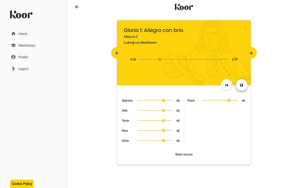 “Koor tries to avoid all of this by recording professionals singing this repertoire and the app presents all the component parts as separate stems. So you have bass, tenor, alto, soprano - even soprano one, soprano two, depending on the parts of the piece. You can study your own part, remove it and sing with the others, listen to the whole piece and even mix the vocals and musical accompaniment. You get so much more detail that you could not get unless someone actually sings it to you. Things like pronunciation, intonation or where to breathe are so much easier to understand; it’s not just volume and pitch.